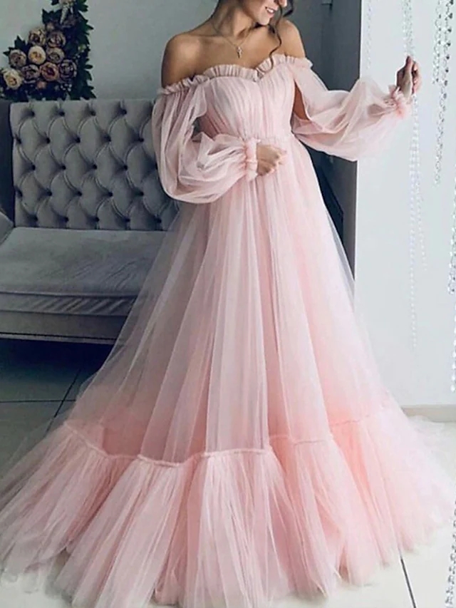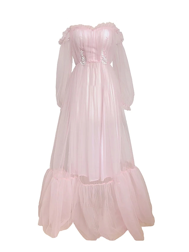 Your Position: Home>full dress> Women's Swing Dress Maxi long Dress Light Pink Light Blue Long Sleeve Pure Color Ruched Mesh Fall Winter Off Shoulder El
